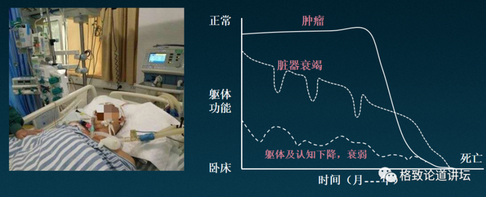 如果是慢性肺病,比如脏器功能衰竭。例如,刚才我们看到被插管的老先生,他就是一次一次的呼吸衰竭、肺部感染,每一次面临生命终结,又被抗生素治疗好过来了,但是也不能治愈。终于有一次他缓不过来,他走了,这就是慢性疾病的轨迹。
