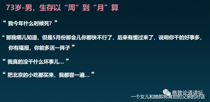 大家可以脑补一下这个情景,这位老人和他女儿是什么状态?他知道自己的生命即将走向终点,他知道他想要什么,他内心是比较平静的。他知道他在“活着”。