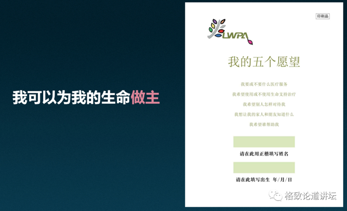 我想告诉大家,并不是这样的,你是可以选择的。就像刚才那位被插管的病人,如果家人当时尊重了他的选择,他可能就不会有插管数年的经历。我们应该了解我们的生命规律,并且有自己选择的权力。