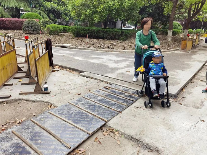 居民们意见之所以特别大,记者踏上路面才明白原委:近百米长的干道以及通向左右两侧楼幢的支路中央,四五米宽的施工区域呈明显下陷,与原路面落差七八厘米。并且,整个下陷区域坑洼不平、高低起伏、井盖密布,行走在上面稍有不慎就会被绊到,崴脚摔跤。居民们告诉记者,去年12月份挖开排管后,春节前后工人们就完成回填,并用水泥对路面进行了硬化。但此后便一直敞着至今,迟迟没有铺平修复。施工方仅在零星区域垫了几块木板,方便两侧居民跨越下陷区域。眼看着一位居民推着的婴儿车轮子卡在坑洼处进退不得,来来往往的居民纷纷向记者表达了不满:“没法走人”“晚上看不清楚,特别容易摔跤”“有邻居在这里摔倒过”……
