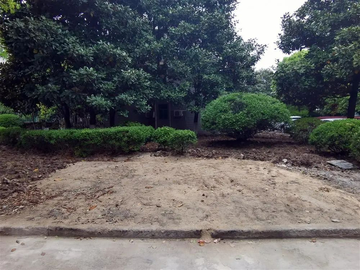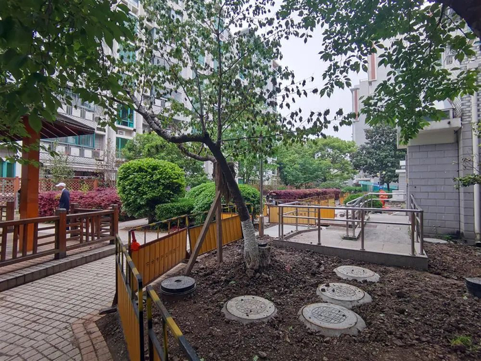 胡先生还带着记者在小区里转了一圈,现场指出了多处野蛮施工留下的痕迹:6支弄13号楼门口,两周前,一棵20年树龄的樱桃树周围被施工挖空后,倒伏在一侧的亭子上。如今树虽然被扶正,但叶子已全部打蔫,能否存活还是未知数;小区里,多处绿化带被用作拌制水泥砂浆的场所,施工结束后,绿化带踩上去硬邦邦,居民形容“变成了水门汀”;此外,施工车辆停上绿化带,留下了深深的车辙……在小区居民整理的一份文件上,还列有居民拍摄的“没有盖的窨井入夜也敞开着”、“风一吹,小区里犹如刮起沙尘暴”等“证据”。