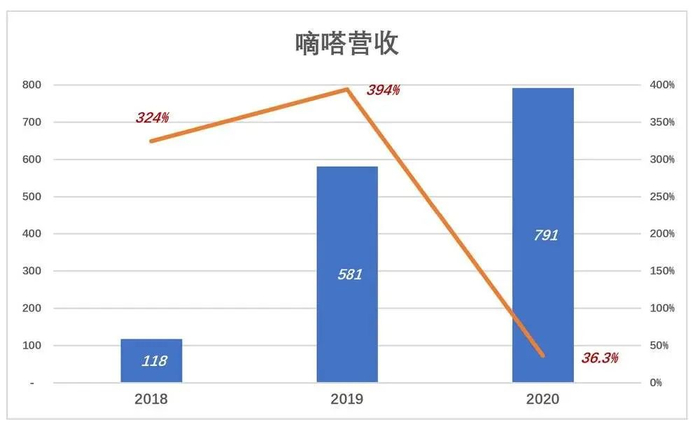 2018年、2019年嘀嗒营收分别为1.18亿、5.81亿,同比增速分别为324%、394%。2020年营收7.91亿,增速回落至36.3%。