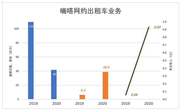 2019年嘀嗒出租车平台促成搭乘1.1亿次(滴滴为4.1亿次);2020年由于疫情影响,出租车业务搭乘数降至4180万次,但收入却从626万增至3887万。