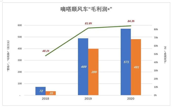 从顺风车收入中剔除“用户奖励”,得到“营收*”“毛利润*”和“毛利润率*”。2020年这三个数据分别为5.71亿、4.81亿和84.3%。不剔除“用户奖励”的情况下,嘀嗒顺风车业务的毛利润率为87.3%。