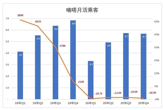 2020年Q1,月活乘客数同比下降19%,Q2同比降幅收窄至11%。下半年仍未恢复增长,Q4平均月活569万、同比下降16.9%。