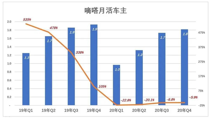 2020年H1,受疫情影响嘀嗒月活车主数降幅超过20%,但下半年并没有恢复增长,Q4平均月活182万,同比下降5.9%。