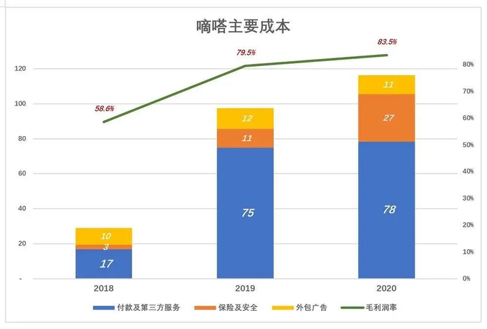 嘀嗒服务成本包括付款处理、第三方服务、保险、安全、外包广告、薪酬、办公费等等。