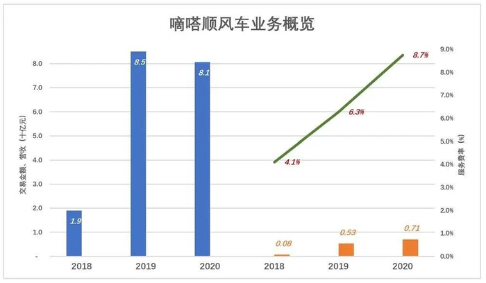 2018年、2019年、2020年顺风车业务交易金额分别为19亿、85亿、81亿,营收分别为7790万、5.33亿和7.06亿,服务费率(变现率)分别为4.1%、6.3%、8.7%。