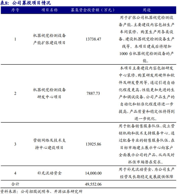 根据公司招股说明书,公司将募集资金扣除发行费用后投资于4个项目:(1)机器视觉检测设备产能扩张建设项目投资占比27.73%,该项目将助力公司扩大机器视觉检测设备产能,建成后将增加1000台机器视觉检测设备产能,解决产能不足问题,实现规模效益;(2)机器视觉检测设备研发中心项目投资占比15.92%,该项目将促使公司通过加大研发投入,大幅提高公司技术水平;(3)营销网络及技术支持中心建设项目投资占比28.10%,该项目将有助于完善公司营销服务体系,进一步扩大市场容量;(4)补充流动资金。