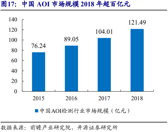 AOI全称自动光学检测,市场规模超百亿,下游主要应用于PCB领域。AOI是基于光学原理对生产中遇到的常见缺陷进行检测的设备,是机器视觉检测中的重要分支,目前主要应用于PCB、面板、半导体等行业。根据前瞻产业研究院,2018年中国AOI市场规模达到121.49亿元,其中PCB领域检测较为成熟,占比达到63.9%,多见于SMT产线的检测中。