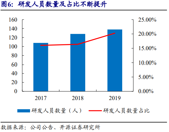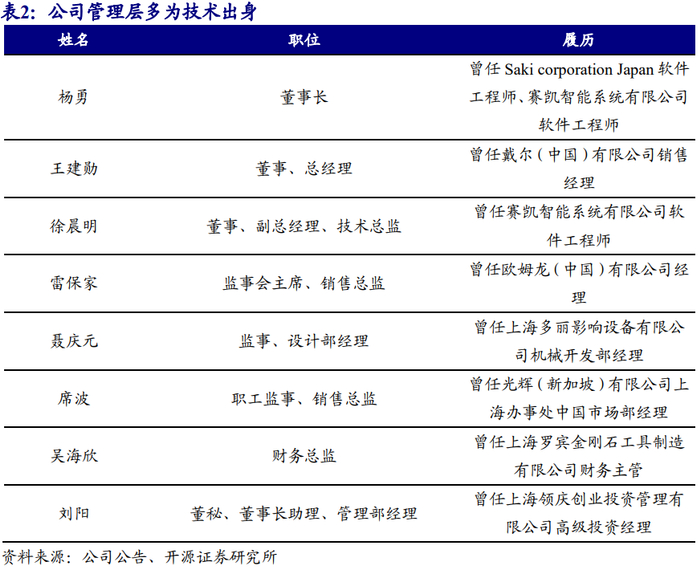管理团队多为技术出身,引领研发及管理,产品核心技术均为自主研发,检测分辨率已提升至半导体后端制程检测要求。公司董事长杨勇、及副总经理、技术总监徐晨明均来自全球领先的光学检测设备厂商Saki Corporation。通过将技术经验与公司管理相结合,公司管理层为公司打造了技术驱动的经营模式,而团队的人员结构稳定也使得公司业务战略具备长期性,对某一方向进行持续的研发投入,实现技术突破。2016-2019年,公司研发费用占比平均达到6.87%,研发人员数量及占比逐年增加,2019年,公司已拥有123名研发人员,占员工总数的比例达到15.79%。目前,公司拥有43项软件著作权、50项专利,并拥有软板光学检测、半导体封装自动光学检测、药品光学检测等丰富的新技术、新产品储备。公司产品的核心技术均为自主研发:从2D/3D机器视觉软件及其底层算法,光学系统及其核心零部件(如光源、3D光学系统中的投影部件等),运动控制器及其底层技术,到精密机械结构等。此外,重视自主研发也使得公司实现了检测分辨率的不断提升:从满足PCBA的检测要求,提升到了满足miniLED的检测要求,进一步提升到了满足半导体后端制程的检测要求。