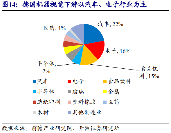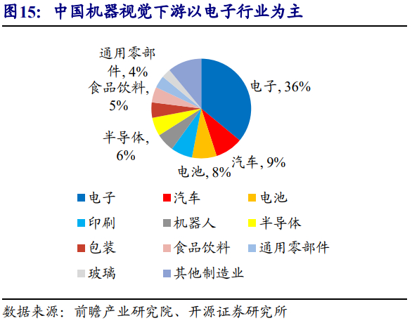 下游应用集中在电子领域,汽车、食品饮料、医药等领域渗透率具备较大提升潜力。由于中国机器视觉行业起步较晚,下游应用主要集中在电子领域,根据前瞻产业研究院数据,2018年电子行业占了下游应用的36%,主要应用在高精度的制造和检测,如晶圆切割、3C表面检测、AOI光学检测、PCB印刷电路等。其中需求最为显著的则是iPhone的生产,其全过程需70套以上的设备。随着机器视觉技术的不断发展,预计下游应用场景将不断丰富,参考机器视觉发展较为成熟的德国,预计未来汽车、医药、食品饮料等领域渗透率具备较大提升潜力。