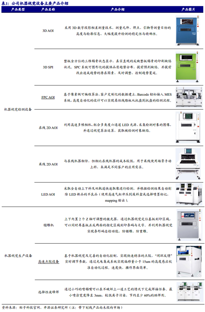 重视底层技术积累,积极布局下游朝阳行业,产品广度不断提升。尽管此前机器视觉业务的下游主要为消费电子公司,受益于当前较完整的底层技术及软件算法的通用性,公司已经具备将机器视觉设备业务拓展至下游多个行业的能力:(1)汽车电子:汽车电子相较消费电子行业对于零部件的可靠性要求更为严格,因此需要3D AOI进行相关检测,公司有望将3D AOI导入汽车电子行业;(2)点胶机:公司已将产品线拓展至点胶机领域,核心技术已经成熟,预计将在近年内推出;(3)FPC行业:柔性线路板由于其重量轻、厚度薄、耐弯曲、结构灵活等材质特点,目前依然只能采用人工目检的方式进行外观缺陷检测,公司已开发出通用的FPC AOI,并已通过客户验证;(4)医药及半导体行业:公司正在开发高速药片光学检测设备和半导体自动光学检测设备。随着下游行业对于机器视觉检测的需求逐渐提升,公司前瞻性的产品布局也将在未来带来新的业绩增长点。