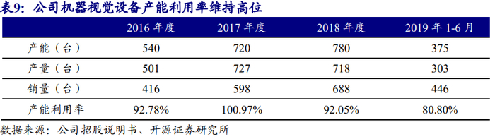 公司产能利用率处于高位,募投项目打开中长期成长空间。公司2019年H1机器视觉设备产能利用率为80.80%,产能相对紧张。随着公司产能逐步释放、技术研发持续保持高投入叠加公司深化建设营销网络,挖掘更多的市场需求,我们认为,产能、技术、营销共振下,公司有望打开中长期成长空间,发展前景广阔。