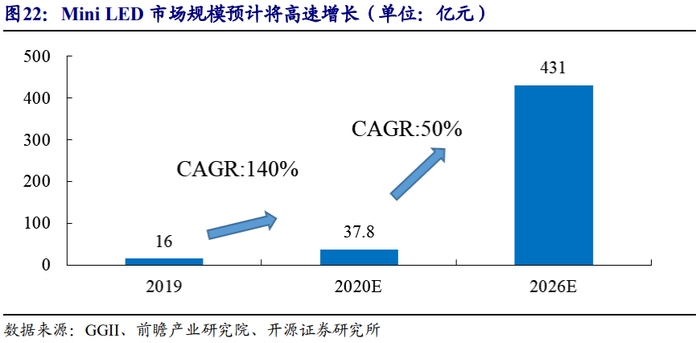 Mini LED时代来临,Mini LED AOI产品已成功导入相关产业,获取行业发展红利。Mini LED技术是在传统LCD基础上不断“进化”而来,相比传统LCD屏幕具备高对比度、高亮度、广色域、广视觉以及超薄等诸多明显优势。与近年来流行的OLED相比,则具备色域更高、亮度更强、分辨率更突出等特点,在用户关注度高的成本、使用寿命等方面更是占据了压倒性的优势。Mini LED作为新兴电子产业,具备广泛需求空间,根据GGII数据显示,2019年中国MiniLED市场规模在16亿元,预计2020年MiniLED市场规模达到37.8亿元,同比增长140%。前瞻产业研究院预测,2026年中国MiniLED行业市场规模有望突破400亿元。公司研制的mini LED AOI设备目前已导入相关产业,有望在行业上升期为公司带来较为显著的业绩增量。
