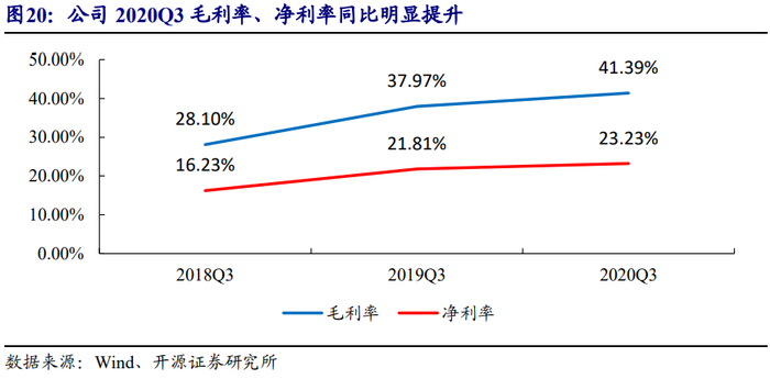 3D检测产品持续放量,盈利能力显著提升。公司于2020年上半年推出的3D AOI及3D SPI已实现量产。(1)3D AOI方面,3D AOI不仅克服现有2D AOI无法解决的缺点和漏洞,还大幅度提升了检测的稳定性、精确性和可靠性。由于3D AOI技术壁垒较高,市场价往往为2D AOI的2-3倍。目前矩子科技的3D AOI已经成功打入比亚迪供应链。(2)3D SPI方面,客户与2D AOI客户重合度极高,有望快速放量:3D SPI为3C产线配置的主要品质检测设备之一,在电子装配制造领域有广泛的应用,进口替代空间较大,并且其客户与公司原有产品的客户高度重叠。公司作为苹果、小米、华为、VIVO 等知名企业或其代工厂的机器视觉设备供应商,有望依靠客户资源优势,快速抢占市场份额。公司3D SPI已于2020Q2进入市场推广期,取得订单超2700万元,目前已经打入了和硕、比亚迪的供应链。此外,从公司2020Q3毛利率及净利率也可知3D新产品具备较高盈利水平:公司2020Q3毛利率达到41.4%,同比提升3.4pct;净利率23.2%,同比提升1.4pct。随着3D新产品的持续放量,我们判断公司的盈利能力有望持续提升。