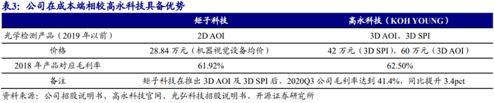 成本较海外品牌更低,产品线实现SMT整线检测,具备高性价比优势。对比海外机器视觉检测龙头,公司在成本端优势凸显:以高永科技为例,其主营业务为3D SPI及3D AOI,而矩子科技2019年及以前主营2D AOI,价格方面,根据光弘科技招股说明书,业内领先的2D AOI、3D SPI、3D AOI单价分别为30万、42万、60万元。但从毛利率对比来看,高永科技近年来毛利率在60%左右,与矩子科技毛利率(根据矩子科技招股说明书,2018年SMT AOI毛利率为61.92%)相近,且矩子科技在推出3D产品后毛利率显著提升,因此公司在成本端相较海外公司更具优势。此外,经过多年技术研发和产品迭代优化,公司产品已经覆盖镭雕机、2D AOI、3D AOI、3D SPI和点胶机等,拥有整条SMT产线的智能检测解决方案能力。同时,公司也通过提供实施远程调试、集中管理、SPC数据分析系统等服务,为客户提供一站式智能解决方案。目前,公司产品在分辨率等关键性指标上已达到国际水平,而采购全套设备的客户往往能够获得一定的折扣,产线使用同一品牌的检测设备对应的学习成本也较产线搭配不同品牌设备要更低,具备高性价比优势。