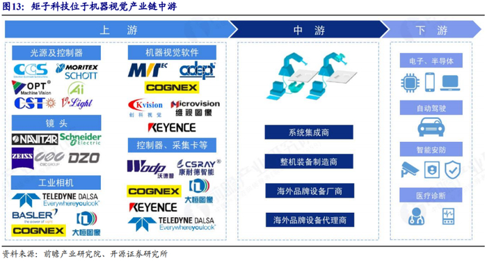 国外厂商占主导地位,国内厂商逐步跟进。机器视觉产业链上游由核心零部件和软件组成,主要包括光源及控制器、镜头、相机、视觉控制器硬件、视觉处理分析软件等;中游则由机器视觉整机制造商、系统集成商等组成,其中矩子科技作为装备制造商位于产业链中游;下游为机器视觉应用领域,主要有电子、工业、半导体、自动驾驶、智能安防等。无论是部件制造还是成套系统领域,海外厂商均有较长的发展历史、较为深厚的技术及案例经验,在全球机器视觉行业占据主导地位。对于部件制造商,由于不同部件的核心技术、生产工艺有较大的区别,企业通常在各自的优势领域深耕,分部件看: