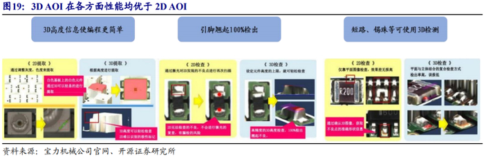3D AOI在各方面性能均优于2D AOI,渗透率将逐渐提高。使用3D AOI进行检测相较2D AOI不仅能提升产品品质,在编程应用方面也能大幅提升效率。且在引脚翘起、整板异物等缺陷检测上,3D AOI均要明显优于2D AOI。但由于3D AOI技术壁垒较高,且价格一般为2D AOI的2-3倍,所以目前中国SMT产线配备的AOI主要以2D AOI为主,仅部分高端厂商会在一条SMT产线中配备一台3D AOI。但是随着汽车电子等行业需求的增加以及国内厂商技术不断突破,预计2D转向3D仍将是大势所趋,3D AOI的渗透率将逐渐提高。