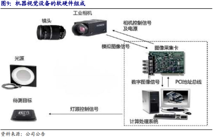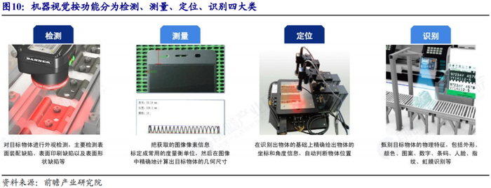 机器视觉设备包括光源、镜头、工业相机、图像采集卡等硬件以及视觉处理软件,主要具备检测、测量、定位、识别四大功能。机器视觉技术主要采用适合被测物体的多角度光源(可见光、红外光、X射线等)及传感器(摄像机等)获取检测对象的图像,通过计算机从图像中提取信息,进行分析、处理,最终代替人眼用于实际检测和控制。一套完整的机器视觉设备一般包括两个部分:第一部分为“视”,即系统的硬件组成部分,主要包括:光源、镜头、工业相机、图像采集卡;第二部分是“觉”,即系统的视觉处理软件。机器视觉目前主要应用于工业自动化领域,对物体进行非接触检测、测量,提高加工精度、发现产品缺陷并进行自动分析决策,是先进制造业的重要组成部分,按功能可分为四大类:检测、测量、定位、识别。