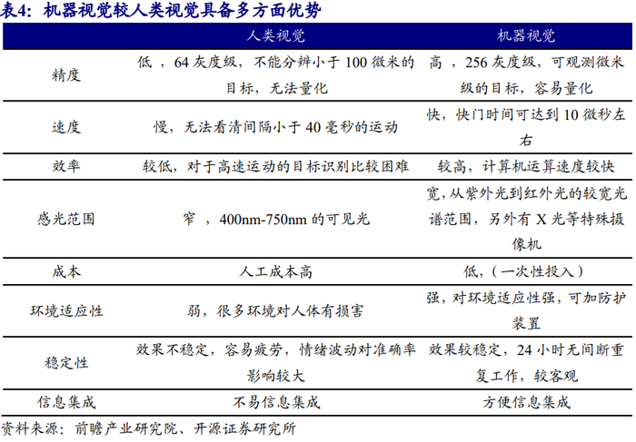 中国机器视觉市场规模过百亿,处于快速增长阶段。人力成本提升、机器视觉的性能优势、下游行业渗透率提升等多因素推动机器视觉行业持续快速发展。中国机器视觉行业起步较晚,上世纪90年代才有少数公司成立,并以代理国外业务为主。但随着工业水平尤其3C电子行业的快速发展,行业步入快速发展阶段。根据中国机器视觉产业联盟统计,2019年中国机器视觉行业规模达103亿元,2015-2019CAGR达35%。根据GGII数据,中国机器视觉市场将于2023年达到155.6亿元,2019-2023年CAGR达24%。我们认为在如下因素驱动下,我国机器视觉行业将持续高速发展:(1)老龄化加深,企业的人力成本不断提升。随着经济的发展,我国人口红利优势急速消退,老龄化程度的加深也使得劳动力供给的紧张局面持续加剧,用工成本不断上升,根据国家统计局数据,2019年中国城镇非私营单位就业人员年平均工资上涨至9.05万元,比2018年增加0.81万元。(2)机器视觉在精确性、效率性等多方面较人眼识别优势明显,并能实现规模经济。具体来看,机器检测比人工视觉检测优势明显:机器视觉检测比人工视觉检测效率高、速度快、精度高、可靠性好,同时,工作时间更长、信息方便集成、适应恶劣环境。此外,若采用人眼识别,企业在扩产时势必需要增设相应人员,而机器视觉设备能适用整条生产线的环节,随着生产规模的扩大能实现规模效应。同时,随着深度学习、3D视觉技术、高精度成像技术和机器视觉互联互通技术的持续发展,机器视觉的性能优势将进一步加大。(3)制造强国大背景下,智能制造的快速发展推动机器视觉需求稳步提升。《中国制造2025》明确指出:加快推动新一代信息技术与制造技术融合发展把智能制造作为两化深度融合的主攻方向。根据赛迪顾问数据,2018年我国智能制造装备市场规模超1.5万亿元,预计2020年将达到2万亿元。但我国工业自动化仍有较大提升空间,据亿欧智库数据,当前制造业90%的企业配有自动化生产线,但仅有40%实现数字化管理,5%打通工厂数据,1%使用智能化技术,且智能制造设备中的关键基础零部件,依然是我国制造业的“软肋”。实现制造强国战略,必须加强包括机器视觉核心软硬件产品在内的本土关键基础零部件的技术、产品和市场能力。机器视觉作为实现工业自动化和智能化的必要手段,将获益于智能制造的快速发展实现市场规模的稳步提升。(4)下游汽车制造、食品饮料等领域渗透率不断提升。目前机器视觉应用主要集中在电子行业,占比达36%,而近年来汽车制造、食品饮料等领域渗透率有望提升。例如,在汽车制造领域,机器视觉主要用于车身装配检测、面板印刷质量检测、字符检测、零件尺寸的精密测量、工件表面缺陷检测、自由曲面检测、间隙检测等几乎所有系统和部件的制造流程。目前一条产线大概配备十几个机器视觉系统,未来随着汽车质量管控、汽车智能化、轻量化趋势对检测提出更高要求,汽车产线对机器视觉技术的需求还会逐步提高。如3D视觉系统可以以高精度间隙对准每一辆车的拼接缝,并对装配的所有车门和车身进行全面检测。