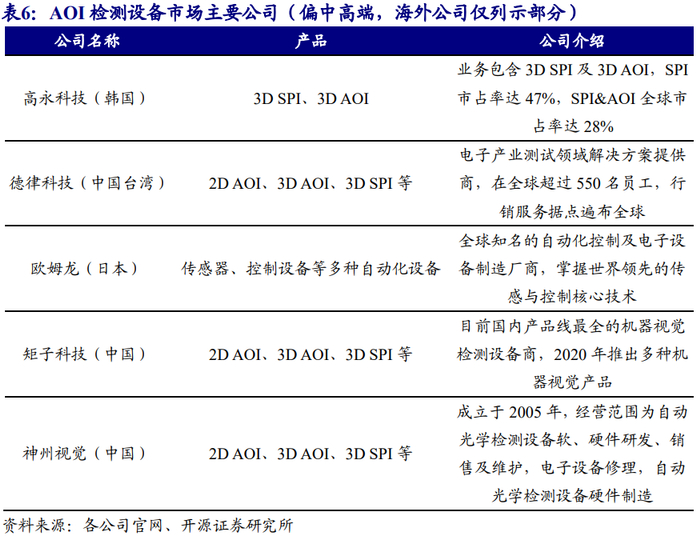 AOI检测设备市场在国内处于快速成长阶段,国内矩子科技等公司在高端市场和海外品牌直接竞争。根据劲拓股份招股说明书,2014年市场上只有20%-30%的SMT生产线装配了AOI检测设备,而国际领先电子制造企业的SMT生产线基本都配置了AOI检测设备。即便目前配备了AOI检测设备的电子制造企业绝大多数也只在炉后配备1台进行全检,而按照国际经验,每条生产线至少要配置3台AOI检测设备放置在生产线不同测试工位。在电子元器件小型化的发展趋势下,人工目视进行检测的难度将愈发增加,因此未来AOI检测设备的装备率会越来越高。目前国内AOI检测设备生产厂家规模大多较小,且以中低端设备为主,高端的AOI检测设备(主要为3D AOI和性能较好的2D AOI)市场份额主要由海外厂商占据,如高永科技(2019年营收达13.17亿元,AOI&SPI设备全球市占率最高,达28%)、德律科技、欧姆龙、美陆等,而矩子科技2019年机器视觉业务(主要为2D AOI)营收为1.91亿元,为高永科技的1/6,市占率约为4.5%,预计随着3D产品的推出,市占率将进一步提升。