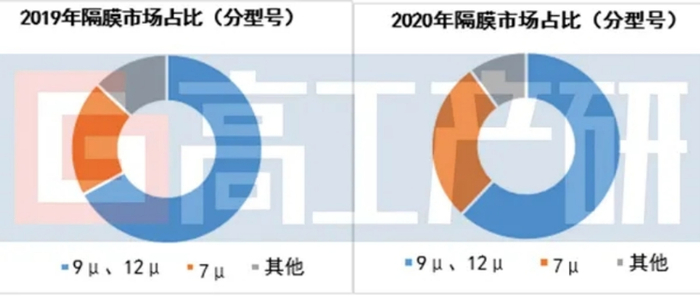 从产品型号来看,2020年受动力能量密度提升、三元动力以及钴酸锂数码电池出货量增长带动,国内锂电池隔膜向薄层化以及功能化方向发展加快。2020年细分产品型号主要集中在7/9/12μm领域,其中5μm湿法隔膜正在加快市场导入,这将对隔膜企业在产品质量和技术方面提出更高的要求。