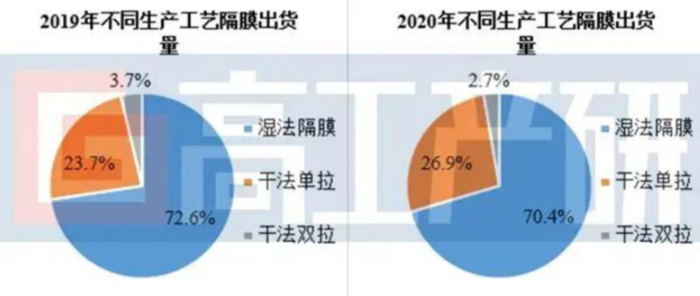从隔膜产品结构来看,2020年湿法隔膜出货量26亿平米,同比增长30%,占总出货量的70%。干法隔膜出货量11亿平米,同比增长超过40%,占总出货量的30%。