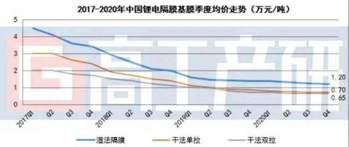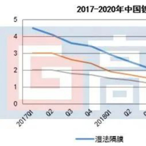 其中,2020年国内隔膜价格继续下行,但降幅收窄,价格走势全年呈现上半年显著下降,下半年基本稳定态势。主要原因有: