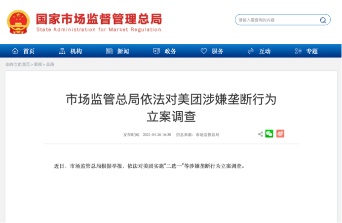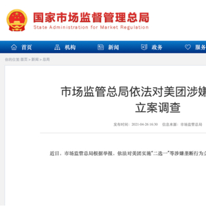 就在刚刚,国家市场监管总局网站突然发布消息:近日,市场监管总局根据举报,依法对美团实施“二选一”等涉嫌垄断行为立案调查。