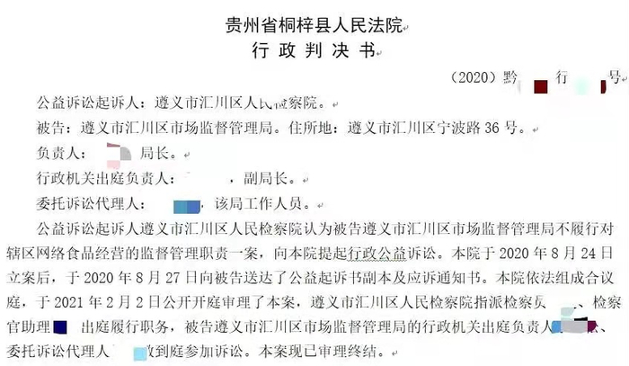 事实上,地方市场监管局因对网络餐饮平台“监管不力”被检察院告上法庭,遵义也不是唯一一例。2020年,湖北恩施宣恩县市场监管局同样因为监管问题被当地检察院提起公益诉讼。
