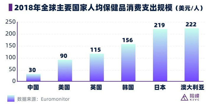 一是“人均消费”:在保健食品的支出上面,美国人每年平均会花90美金,澳大利亚人则达到了222美金,而中国人只有30美金。