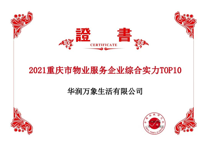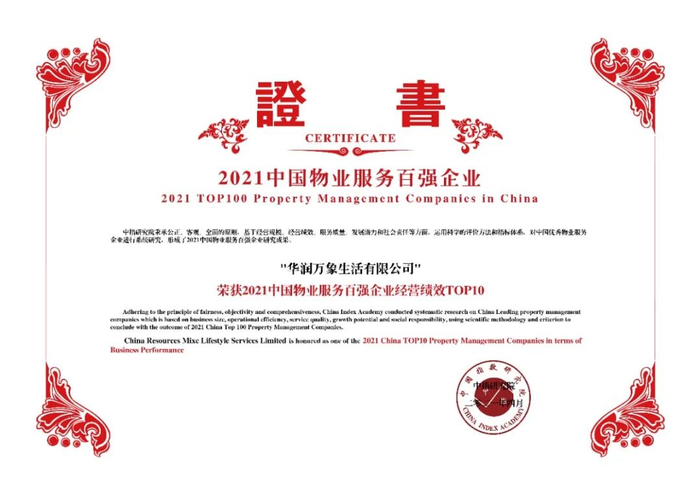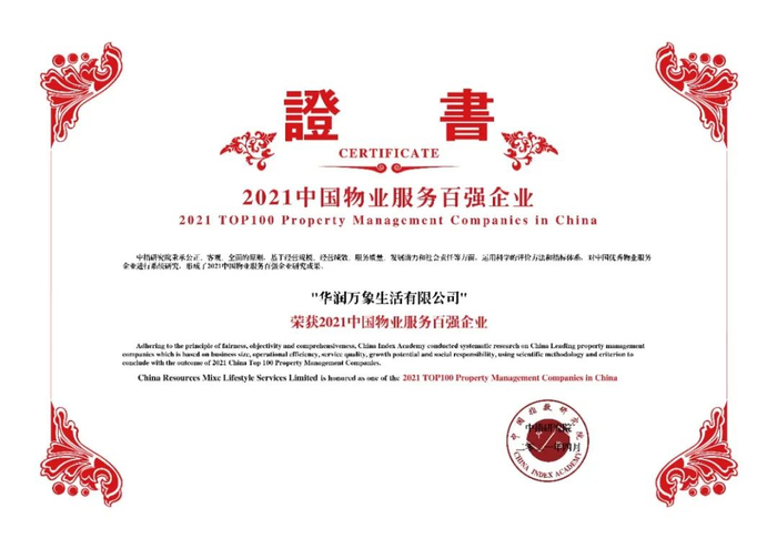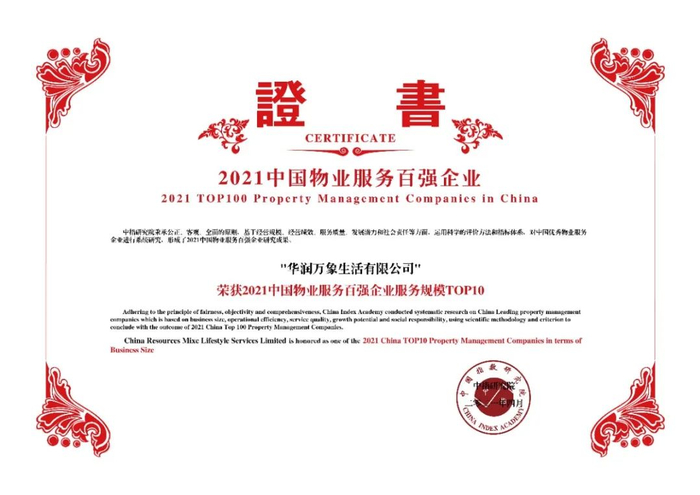 在此次研究中,华润万象生活凭借出色的综合实力荣膺“2021中国物业服务百强企业”、“2021中国物业服务百强企业经营绩效TOP10”、“2021中国物业服务百强企业服务规模TOP10”、"2021中国物业服务年度社会责任感企业“、”2021中国商业物业管理优秀企业"、“2021中国主要城市物业服务企业综合实力TOP10“