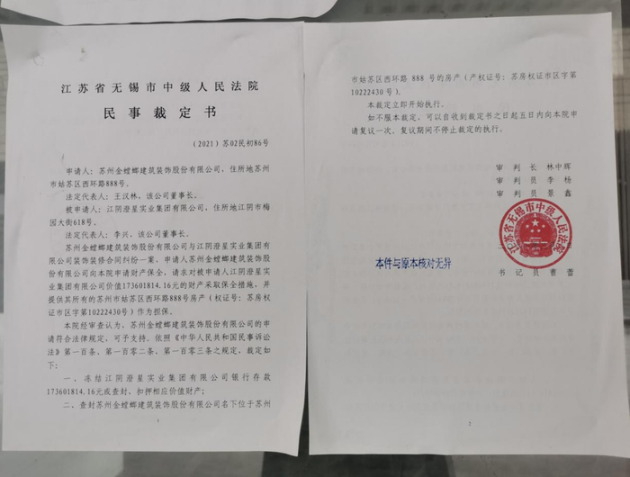 张贴在澄星大厦一楼的无锡中院《民事裁定书》和《查封公告》([2021]苏02民初86号)显示,因苏州金螳螂建筑装饰股份有限公司(以下简称“金螳螂”,002081.SZ)与澄星集团存在装饰装修合同纠纷,前者已向无锡中院申请财产保全,并对澄星集团名下价值1.74亿元财产采取保全措施。