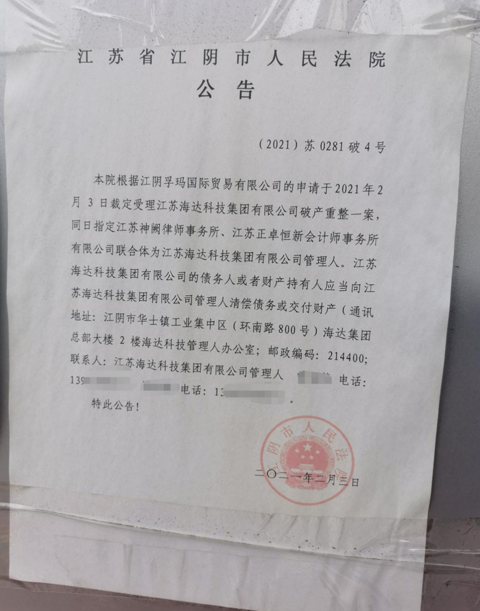在另一份落款日期同样为2021年2月3日的江阴市人民法院《通知书》显示,海达集团各债权人应在通知之日起至5月24日前向海达集团管理人办公室申报债权。江阴市人民法院将于6月2日下午在该院召开第一次债权人会议。