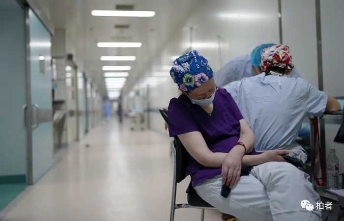 史颂民在手术室外椅子上小憩。为了完成更多的手术,医护人员每天连续不断工作十二个小时。