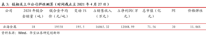 A股上市公司中对于镁合金龙头公司市值弹性(假设镁锭价格涨1%、上游原材料、加工费保持不变,即涨价带来的销售收入全部转换为利润;所得税25%,对上涨的净利润按照30倍PE给与估值,则上涨的市值/当前市值=公司的价格弹性),如下:
