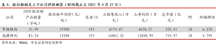 A股上市公司中对于钛白粉龙头公司市值弹性(假设钛白粉价格涨1%、上游原材料、加工费保持不变,即涨价带来的销售收入全部转换为利润;所得税25%,对上涨的净利润按照30倍PE给与估值,则上涨的市值/当前市值=公司的价格弹性),如下: