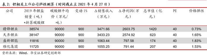 锂是新能源车领域的重要上游材料,价格弹性是判断相关材料生产企业盈利变化的重要依据。A股上市公司中对于锂资源龙头公司市值弹性(假设主营产品价格涨1%、上游原材料、加工费保持不变,即涨价带来的销售收入全部转换为利润;所得税25%,对上涨的净利润按照40倍PE给与估值,则上涨的市值/当前市值=公司的价格弹性),如下: