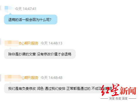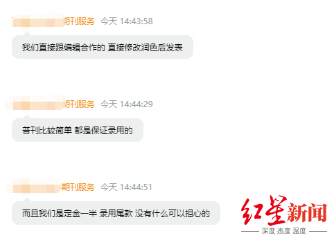 “我们会负责修改、润色,只要不是抄袭的文章,经我们安排正常都是通过的,不成功全额退款。而且,普刊比较简单,都是保证录用的。”该工作人员告诉记者。对于同样的期刊,不同代理商给出不同价格的情况,一知情代理商表示,因各代理商与期刊杂志谈下来的价格不同,加上有些代理商会再向下寻找自己的“分销商”,从而导致市面上相同期刊出现不同的价格,“有可能你接触的是直接与杂志社合作的代理商,他会给你很低的价格,也有可能你接触的是‘分销商’,那他给你的价格就会有中间费,要高一些。”