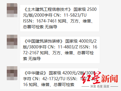 据其推荐的3本期刊,记者联系上另一期刊发表代理商。一名工作人员表示,《土木建筑工程信息技术》的代发价为1800元/3000-5000字符,代写代发则是2200元;《中华建设》的代发价为1600元/3000-5000字符;《中国建筑装饰装修》因未被知网收录则没有合作。