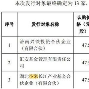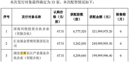 值得注意的是,专注在半导体、新材料领域投资的小米长江产业基金,此次定增获配股数4209640股,获配金额约2亿元。