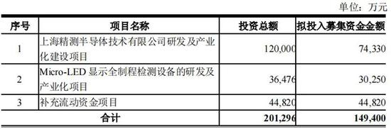 据了解,此次定增募集资金将投向:上海精测半导体技术有限公司研发及产业化建设项目、Micro-LED 显示全制程检测设备的研发及产业化项目和补充流动资金项目。