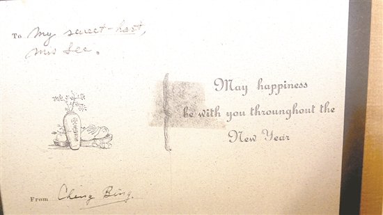 据介绍,陈毅安当年曾为爱人李志强寄去书信共54封。另有一张藏于井冈山革命博物馆的英文新年贺卡尤为特殊。贺卡是99年前的1922年,陈毅安送给李志强的新年祝福。贺卡封面是一名女话务员的头像,下方写着“恭贺新禧”四个金字,卡片中间用绿色毛线固定,内页写着字迹优美的英文——