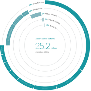 根据苹果2020年环境报告,整个公司2019的年排放量为2510万吨。其中办公运营的碳排放基本为0,碳排放集中在产品的生产、流通和使用环节。以iPhone 11 pro Max为例,一台设备的全生命周期大概排放86千克的二氧化碳,其中78%是制造环节产生,3%是交通环节产生,18%是全生命周期用的电力导致的排放。