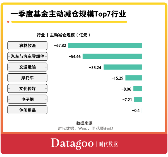 从基金一季度主动减仓规模来看,主动减仓规模居前的行业依次是农林牧渔、汽车与汽车零部件、交通运输、摩托车、文化传媒、电子烟、休闲用品。其中,农林牧渔行业整体一季度被基金减仓规模最大,减仓67.82亿元;其次是汽车与汽车零部件行业,减仓54.46亿元。