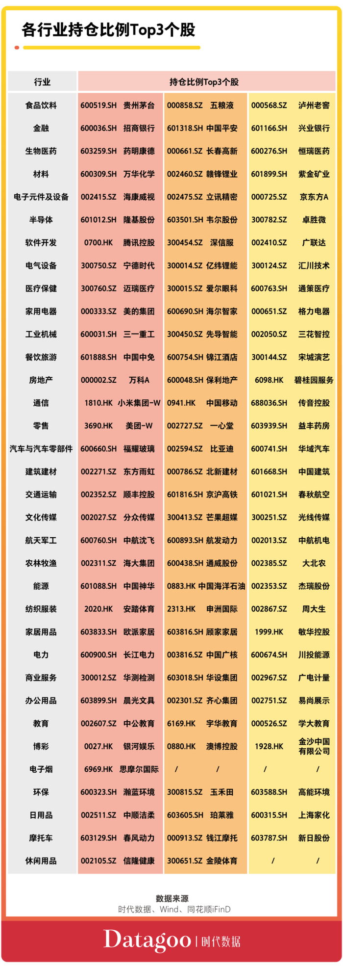 各行业基金持仓比例前三个股