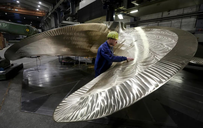 2020年12月10日,德国工厂内,一名工人正在制造船只的螺旋桨