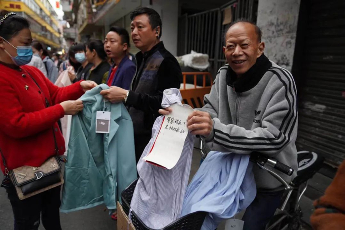3月3日,元宵节之后,广州制衣厂的老板们排成一列,手里拿着样衣站在康乐村街头,招募务工人员。(翁洹 摄/ 视觉中国供图)