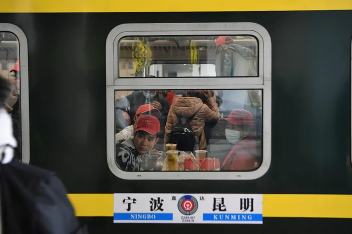 2月28日,1980余名云南会泽籍农民工在昆明火车站乘坐免费列车,赴浙江绍兴、义乌、宁波及江苏南通等地务工。(刘冉阳摄/视觉中国供图)